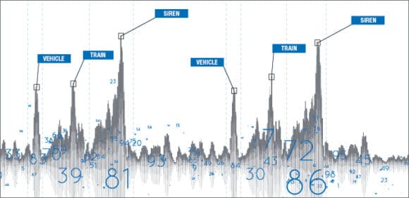 Das NoiseScout System zeichnet Lärm-Ereignisse auf, wenn vordefinierte Pegel überschritten werden. Signifikante Ausschnitte dieser Aufzeichnungen werden mit einer umfangreichen Bibliothek von Lärm-Ereignissen verglichen. Daraus entsteht eine bewertete Klassifizierung der Aufzeichnung in mehrere Lärmkategorien.
