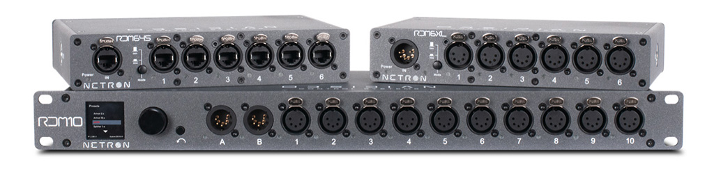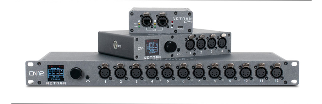 Auch die drei DMX-Gateways sind umfangreich ausgestattet. Erhältlich sind sie mit vier oder zwölf DMX-Ausgängen in XLR 5 pol Ausführung. Sämtliche Einstellungen sollen sich direkt am Gerät mittels OLED mit komfortabler Jog-Wheel-Bedienung vornehmen lassen. Auch aus der Ferne sind alle Geräte dank integriertem Webserver plattformunabhängig von jedem Webbrowser aus zu konfigurieren. Beim Netron EP4 wurde mit Augenmerk auf kompakte Abmessungen für den Installationsbereich auf Display und internes Netzteil verzichtet. Das Gerät erhält seine Betriebsspannung via PoE (Power over Ethernet). Protokollseitig verständigen sich die DMX-Gateways mit ArtNet als auch mit sACN und sollen über die volle RDM-Funktionalität verfügen.