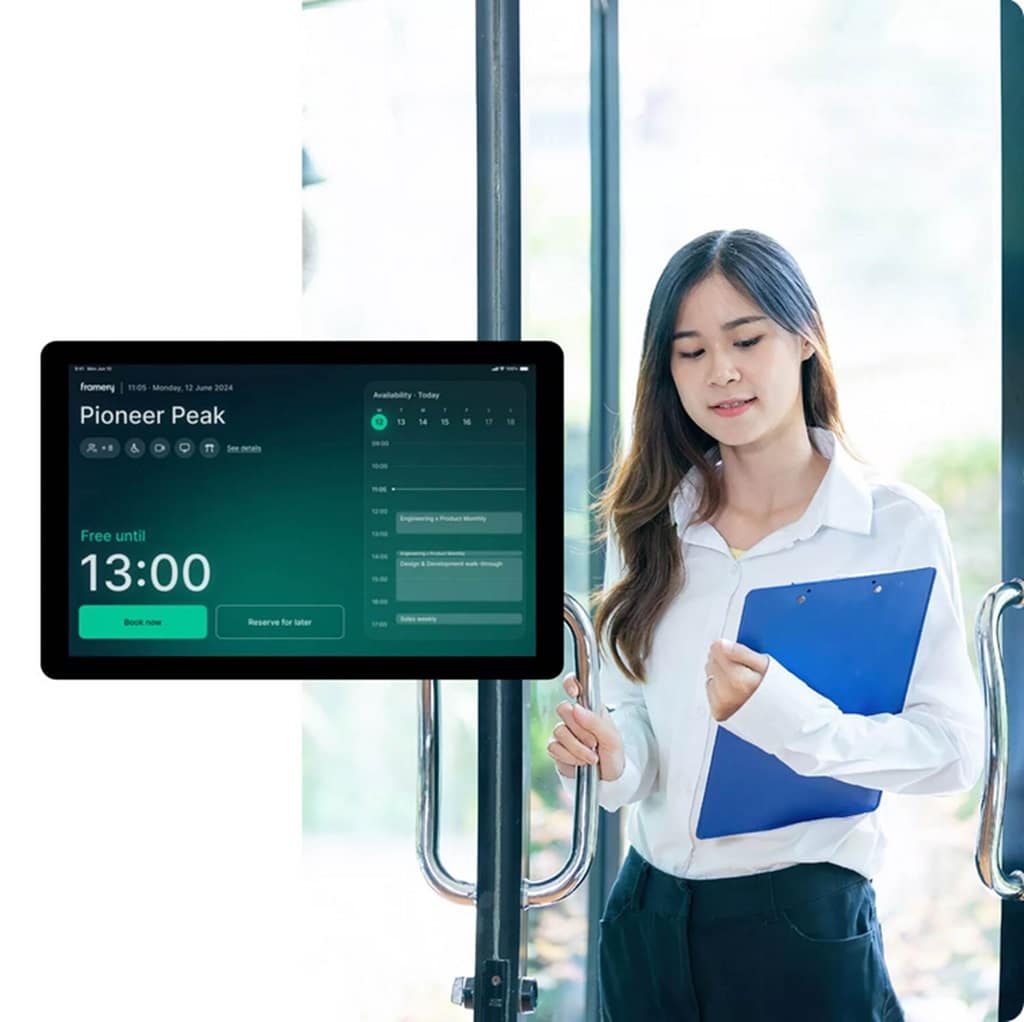 Reibungslose Integration: Die Raumbuchungssoftware nutzt Tablets oder Geräte, die unter iOS, Android oder Windows laufen, um aktuelle Besprechungen und den Status von Besprechungsräumen anzuzeigen.
