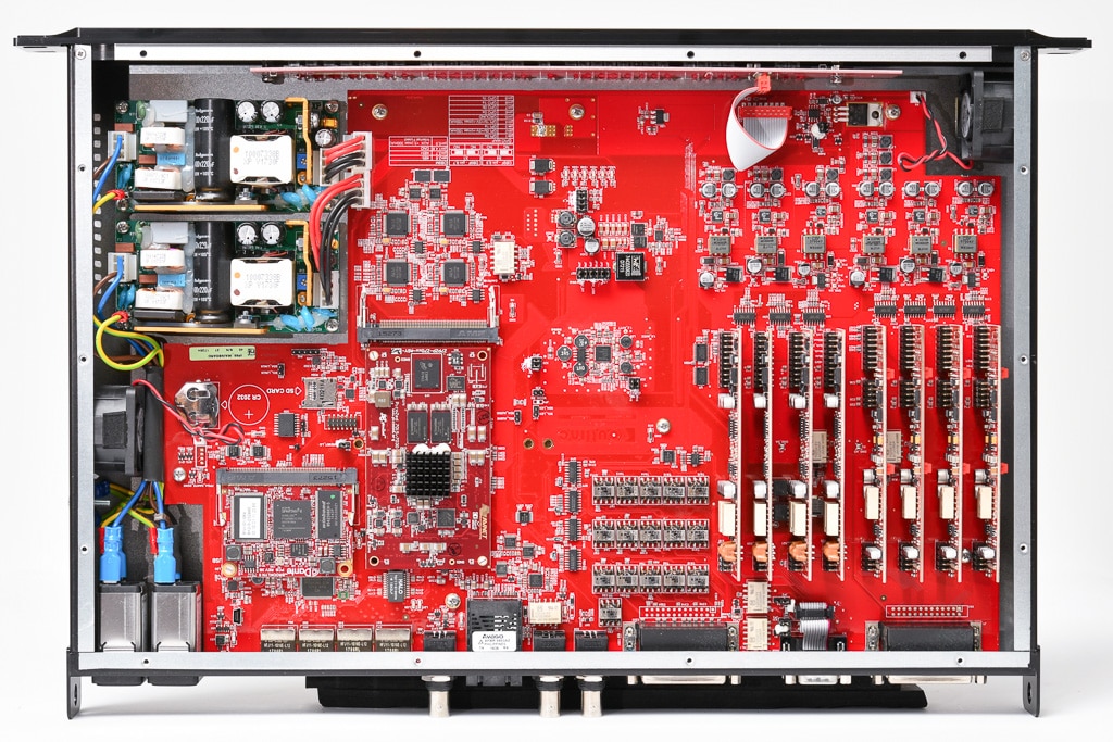 Innenansicht des Newton aus unserem Testbericht mit einem großen PCB und Aufsteck-Boards für das Dante-Brooklyn-Modul, den FPGA-Baustein und die analogen Ein- und Ausgänge (Bild: Anselm Goertz)