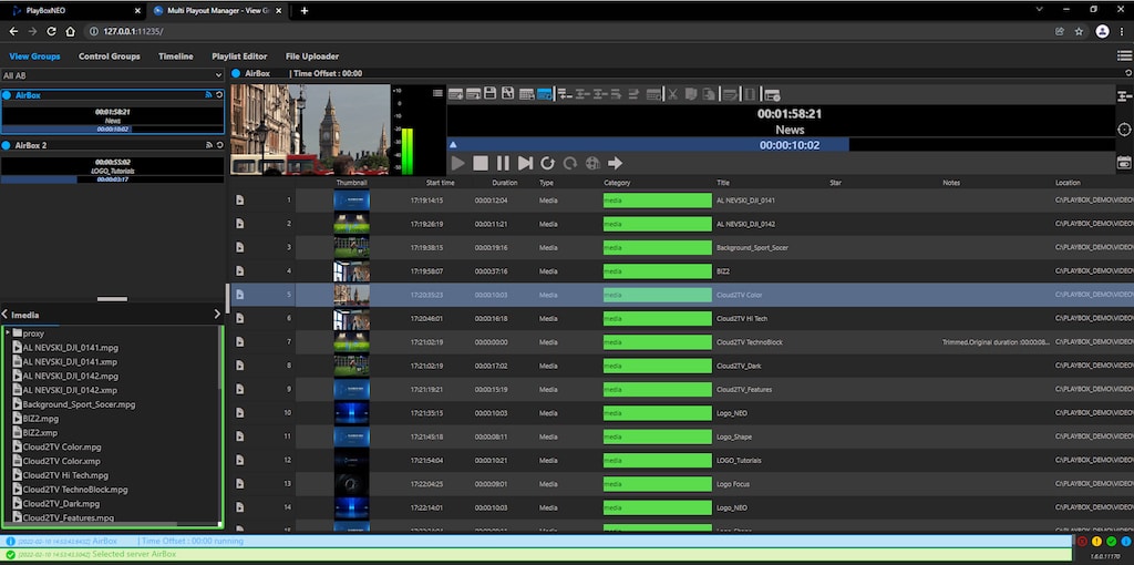 Mit Playbox Neo MPM können mehrere AirBox Neo-20-Kanäle über IP von verschiedenen Orten ferngesteuert werden. Zu den im MPM zugänglichen Steuerungsfunktionen gehören die Änderung von Wiedergabelisten, die manuelle Auslösung von Ereignissen, benutzerkonfigurierbare Voreinstellungen für den Zugriff auf Logos per Tastendruck, die Steuerung von IP-Routern und zusätzliche Tools wie die Steuerung von Grafiken und Texten.