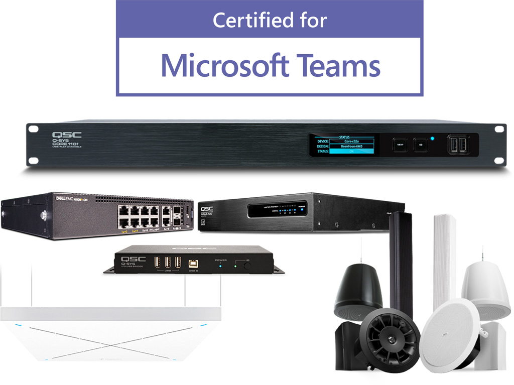 Im Mittelpunkt des neu zertifizierten QSC Zubehör-Portfolios für Teams Rooms stehen das Q-SYS Ecosystem und der Q-SYS 110f Core Prozessor, der sämtliche Audio-, Video- und Steuerungs-Prozesse für native QSC- und Drittanbieter-Peripherie in einem einzigen integrierten Gerät kombiniert. Unterstützt wird auch das vollständige Lineup netzwerkfähiger, QSC Energy Star qualifizierter Leistungsendstufen der SPA Serie und die komplette Serie der QSC Acoustic Design Lautsprecher.