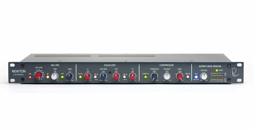Der Newton enthält einen Class-A-Mikrofonvorverstärker, eine 3-Band-EQ-Sektion, einen VCA-Kompressor und speziell von Rupert Neve Designs entwickelte, transformatorgekoppelte Ausgänge mit der beliebten Sättigungsfunktion „variable Silk Red & Blue.“