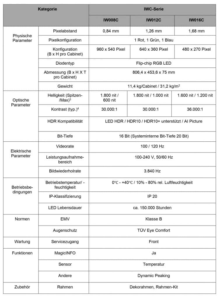 Darüber hinaus hat Samsung hat die Ultra-Chroma-Technologie in die IWC-Serie integriert. Sie erzeugt engere Wellenlängen, wodurch zweimal reinere und präzisere RGB-Farben als bei herkömmlichen Samsung LEDs erzeugt würden. Die Ergebnisse basieren auf internen Tests im Vergleich zu „herkömmlichen LED-Signage-Displays“ von Samsung.