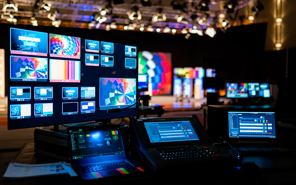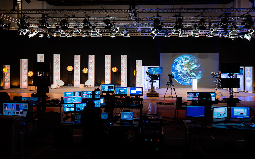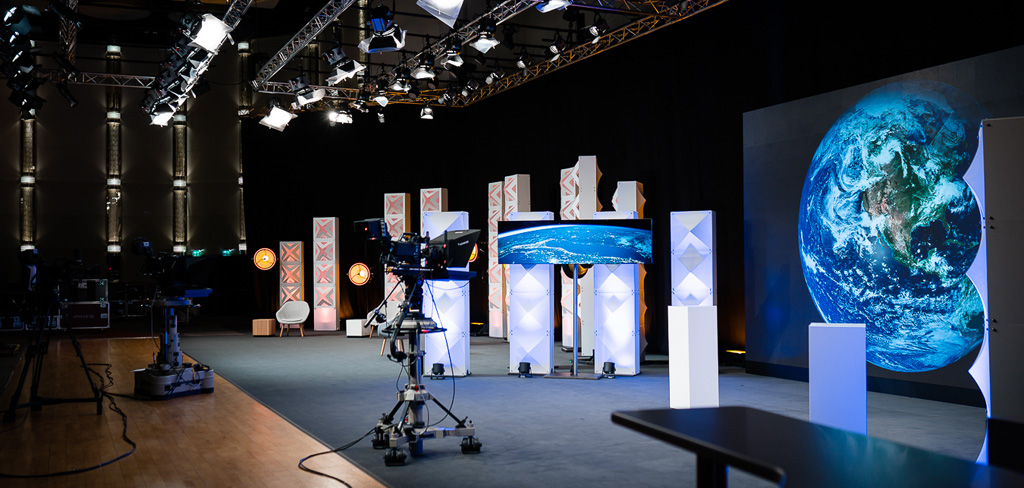 Dank Hightech-Ausstattung sind Ausleuchtung der Redner, Mikrofonierung und Monitorbespielung individuell steuerbar. Drei Kamerazüge sorgen für wechselnde Studio-Perspektiven. Der neutrale Hintergrund kann an das Veranstaltungsdesign leicht angepasst werden. Die 6 × 3,5 m große LED-Wand kann mit Videos, Fotos und Schrifteinblendungen bespielt werden.