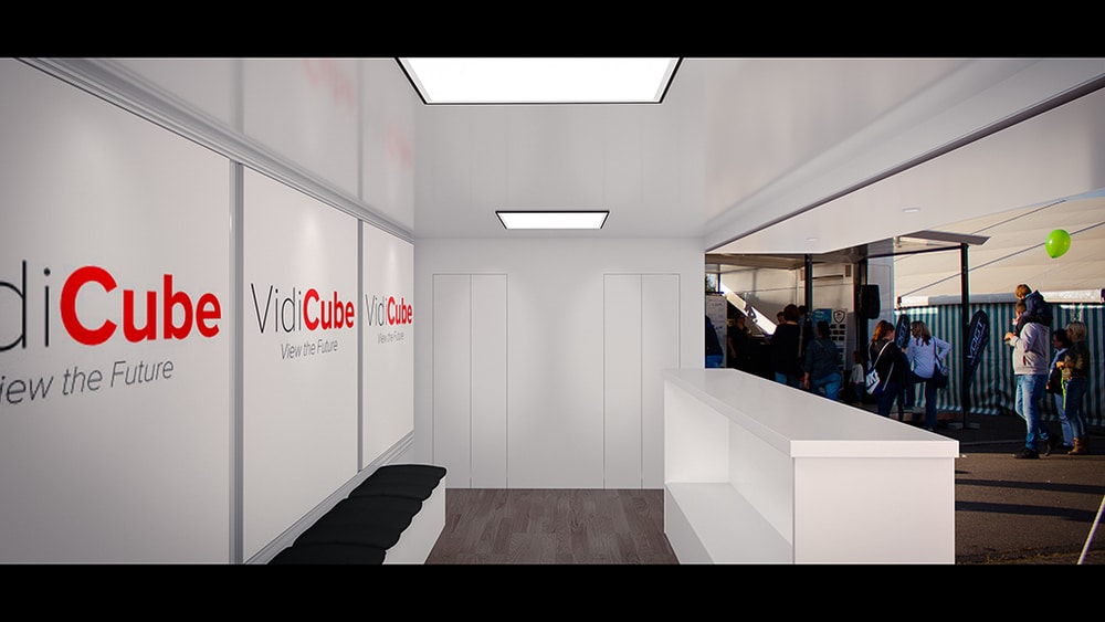 Der Vidicube ist eine mobile Event-Unit in Leichtbauweise, deren Konstruktion auf einem Fahrzeuganhänger basiert. Innovativ ist die Integration eines tageslichtfähigen Audio- und Videosystems auf dem Dach des Promotionanhängers. Bis zu vier SMD-Screens mit einer Auflösung von 6 Millimetern und einer Gesamtfläche von fast 25 Quadratmetern können in die aufklappbare Vorrichtung nach Aufbau der Box montiert werden. Der Einsatz audiovisueller Medien im mobilen Vidicube ermöglicht eine individuelle und wirkungsvolle Markeninszenierung. Neben klassischen Maßnahmen, wie der Präsentation von Werbespots, Imagefilmen, Produktvideos oder der Übertragung von Livestreams, sind die Screens für die direkte Interaktion mit dem Publikum ideal: Beispielsweise kann der Präsentationsraum als Fotostudio genutzt werden – mit unmittelbarer Übertragung der entstandenen Bilder auf die Videowände. Die Einbindung interaktiver Spiele in den Promotionstand ist ein weiteres Tool, das hohe Aufmerksamkeit erzeugt und emotionale Markenerlebnisse schafft.