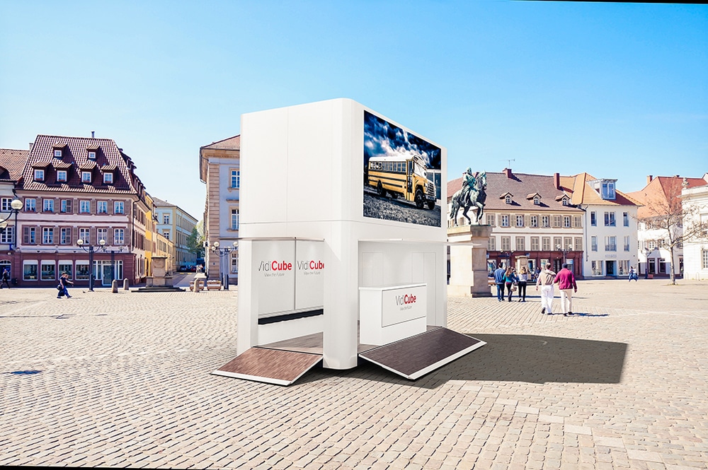 Mit einer Länge von 4,5 Metern, einer Breite von 2,5 Metern und einer Höhe von 4,9 Metern ist es mit dem multimedialen Präsentationsmodul möglich, neben Outdoor-Einsätzen auch Promotionaktionen in geschlossenen Räumen zu realisieren. Durch die intelligente Bauweise des Vidicubes kommen viele Standplätze sowohl indoor als auch outdoor infrage. Schnell aufeinanderfolgende Stationen, beispielsweise im Rahmen von Roadshows, stellen keine Herausforderung dar, da der Präsentationsstand mit geringem Personalaufwand innerhalb kürzester Zeit auf- und abgebaut sowie einfach transportiert werden kann.
