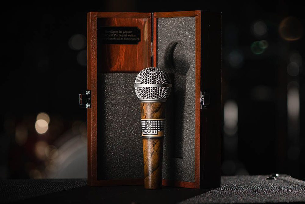 „Wir haben uns überlegt, was am besten zu Udo passt, und da Eierlikör in der Umsetzung einfach zu schwierig war, wurde es ein SM58 im Zigarren-Look“, erklärt Markus Winkler, Managing Director bei Shure Europe. „Die Wahl des Mikros selbst war mehr als einfach, schließlich schleudert Udo das SM58 bei jedem Konzert mit großer Hingabe umher.“