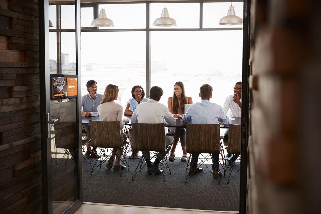 • Besprechungsraum-Display: Unternehmen können Besprechungsraum-Displays mit erweiterten Workflows anpassen, die Informationen zum Raum, zur Besprechung und mehr anzeigen. Da Signage automatisch aktualisiert wird, wenn Besprechungen beginnen und enden, sollen Wartezeiten und Energiekosten sinken, wodurch die Produktivität erhöht werden soll.