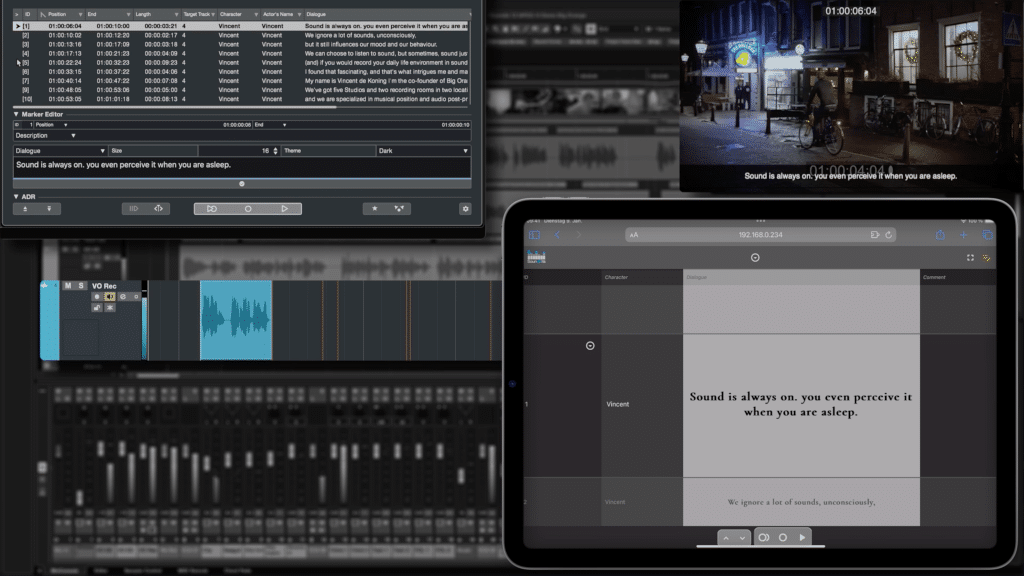 Mithilfe des ADR Script Readers können ADR-Takes nun via Webbrowser innerhalb des gleichen LAN-Netzwerks auf Tablets und Laptops angezeigt werden, um beispielsweise Sprecher:innen ein digitales Skript an die Hand zu geben oder Editor:innen und Session-Direktor:innen die Möglichkeit einzuräumen, mittels Nuendos Marker-Daten sofortige Änderungen und Notizen einzupflegen.
