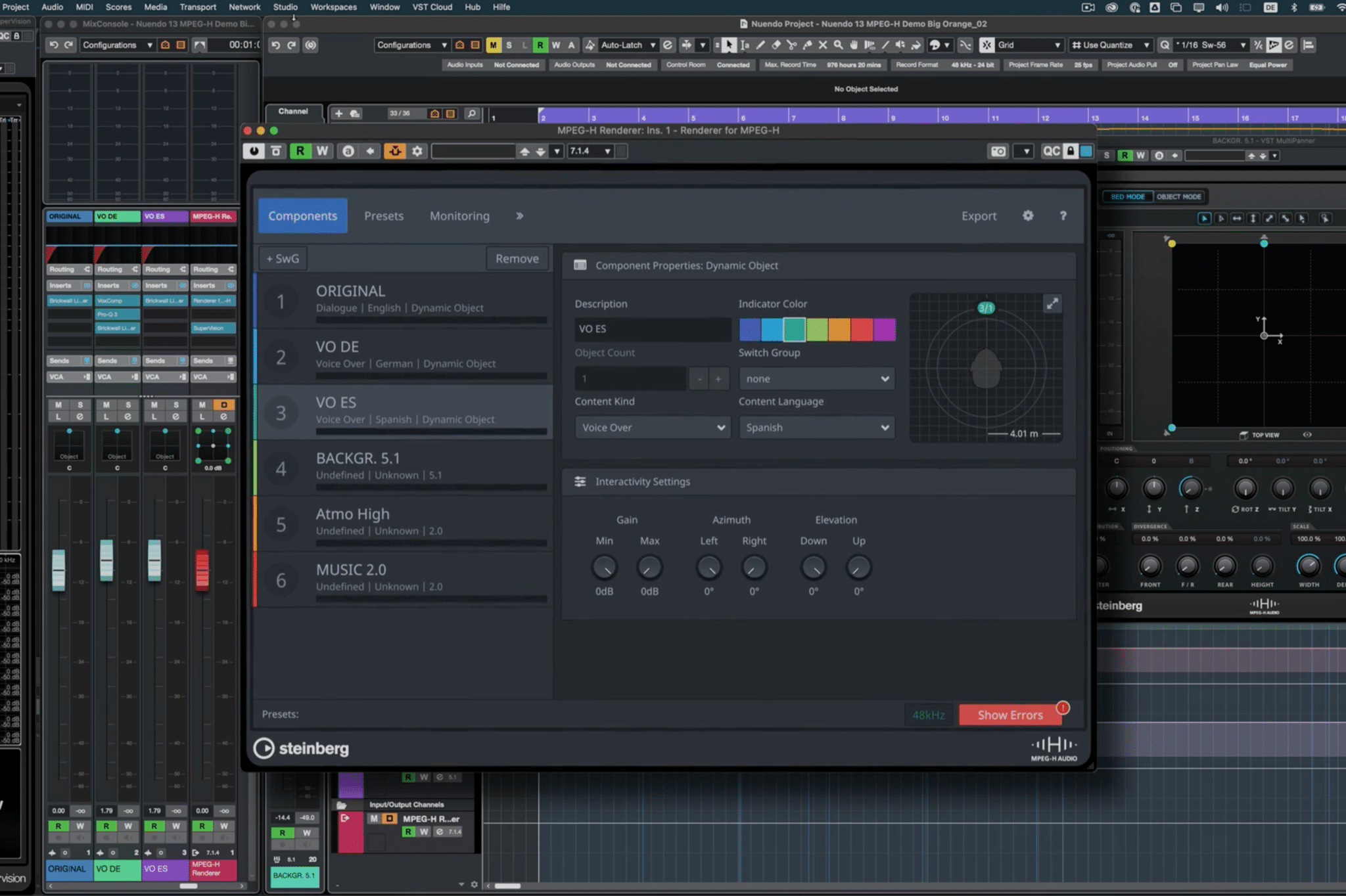 Neu in Nuendo 13 ist das integrierte Authoring und Content-Mixing für das objektbasierte MPEG-H-Audio-Format. Über das Angebot Metadaten-basierter Interaktivitätsoptionen und verschiedener Mixversionen in Presetform lassen sich Projekte als MPEG-H-ADM- oder MPEG-H-Master-Dateien speichern.