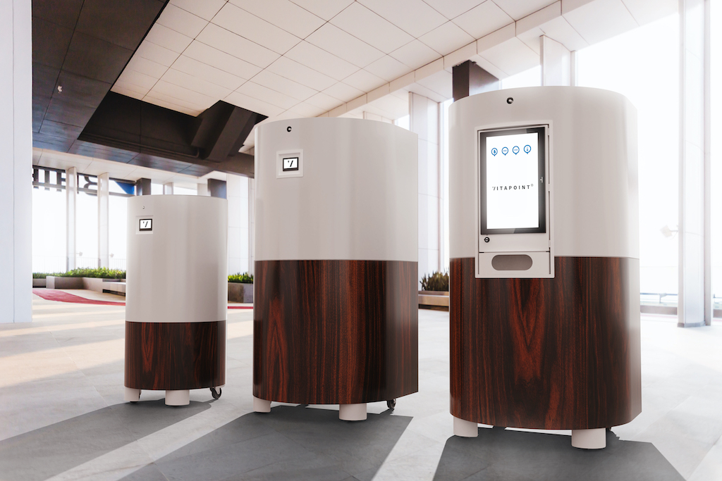 Die Vitapoint 6000 Pro Variante ist zusätzlich mit einem 24 Zoll PCAP Touch Display ausgestattet um zum einen Luftdaten wie CO² Gehalt, Temperatur und Luftfeuchtigkeit anzuzeigen und zum anderen um Herstellerlogos oder Werbefilme abspielen zu lassen. Ein dezent integrierter Desinfektionsmittelspender mit Bewegungssensor und Tropfschale rundet das ganze Paket ab.