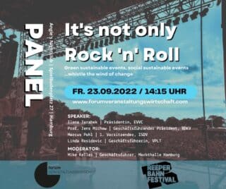 Die Alllianz lädt im Rahmen des Reeperbahn Festivals 2022 zu einem Panel unter dem Motto „It’s not only Rock ‘n‘ Roll – Green sustainable events, social sustainable events…whistle the wind of change“ ein. Die Expert:innen diskutieren über die Zukunft der Branche unter den Aspekten Nachhaltigkeit und Sozialverträglichkeit.