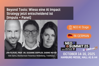 Künstliche Intelligenz verändert unsere Arbeitswelt radikal – und wer nur auf neue Tools und Automatisierungen schaut, übersieht das große Bild. Auf dem NEO Summit 25 diskutieren Jan Filipzik (Vok Dams), Dirk Hagen (Hochschule Hannover) und Sabine Mayer (Trendhouse) im Panel, wie Unternehmen sich strategisch auf die tiefgreifenden Veränderungen vorbereiten und eine AI Impact Strategy entwickeln können, die Orientierung über kurzfristige Effizienzgewinne hinaus bietet.